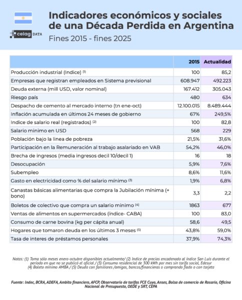 El paso del tiempo permite evaluar con mayor claridad el impacto de las políticas públicas. A diez años del inicio del gobierno de Mauricio Macri (10 de diciembre de 2015), Argentina evidencia un retroceso sostenido en la mayoría de los indicadores económicos y sociales. Según un estudio realizado por el Centro Estratégico Latinoamericano de Geopolítica (CELAG), este período puede caracterizarse sin ambigüedades como una “Década Perdida”, marcada por la caída del salario real, el aumento de la deuda externa, el crecimiento de la pobreza y un deterioro generalizado de la calidad de vida.