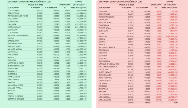 En el otro extremo, señaló a “los dos grandes, San Luis y Villa Mercedes en zona roja con un 2% menos y un 8 % menos respectivamente”. Explicó que esto responde a una lógica aritmética: “los que crecieron menos o muy cerca de la media provincial, lógicamente van a tener menos coeficiente. Por ej. Villa Mercedes creció en habitantes un 16,88 % y la media provincial fue del 25.21 %”.