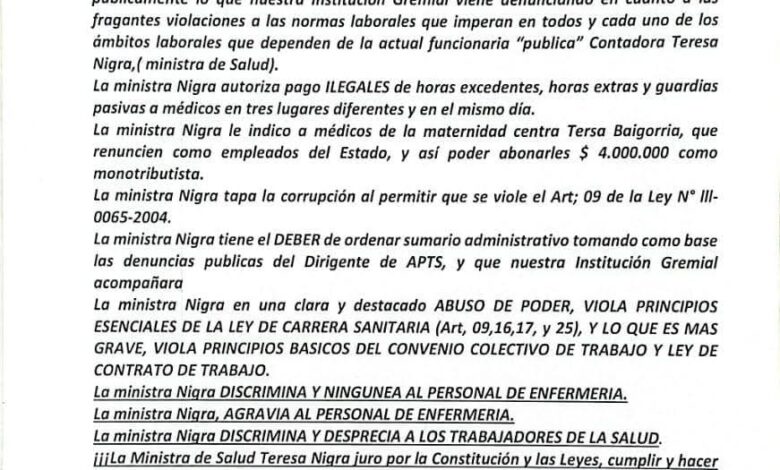 Fuerte denuncia de Asociacion Trabajadores de la Sanidad: acusan a la ministra Teresa Nigra de violaciones laborales y corrupción en el sistema de salud