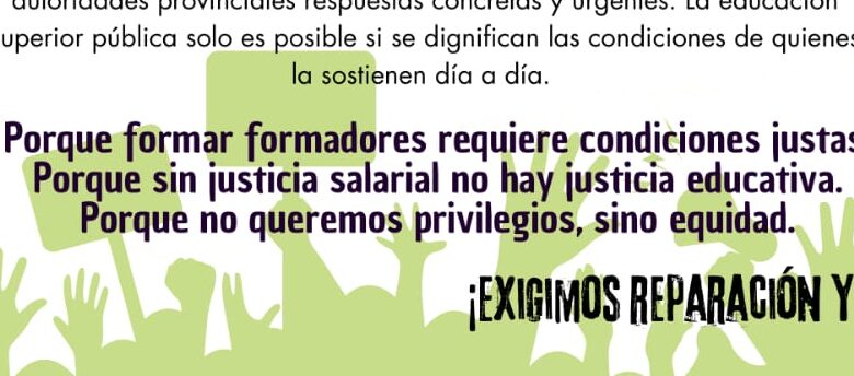 Queremos manifestar públicamente nuestro reclamo por una urgente reparación salarial para las y los docentes de nivel superior de gestión pública, quienes nos encontramos en clara desventaja frente a los institutos de nivel superior de gestión privada subvencionada, e incluso frente al salario docente correspondiente al nivel medio. Desde hace más de un año venimos solicitando formalmente a las autoridades provinciales sin obtener respuestas.