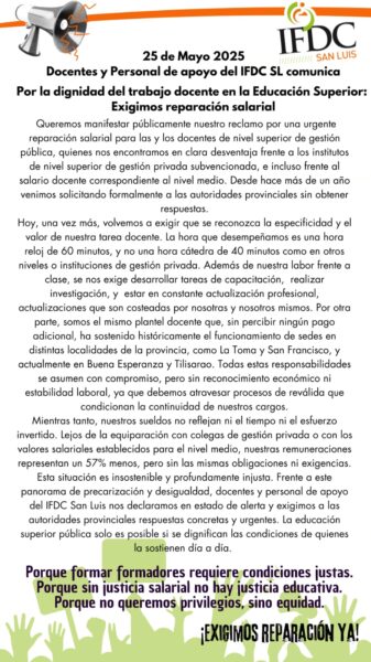 La carta destaca que esta situación de precarización y desigualdad es insostenible y profundamente injusta, afectando a docentes y personal de apoyo del IFDC San Luis, quienes se declararon en estado de alerta y exigieron a las autoridades provinciales respuestas concretas y urgentes. «Porque formar formadores requiere condiciones justas. Porque sin justicia salarial no hay justicia educativa. Porque no queremos privilegios, sino equidad. ¡Exigimos reparación ya!», concluye el comunicado.